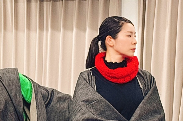編み上がったばかりのマフラーを身につけて、今日も稽古に向かいます。