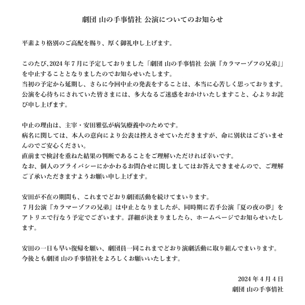 劇団 山の手事情社 公演についてのお知らせ